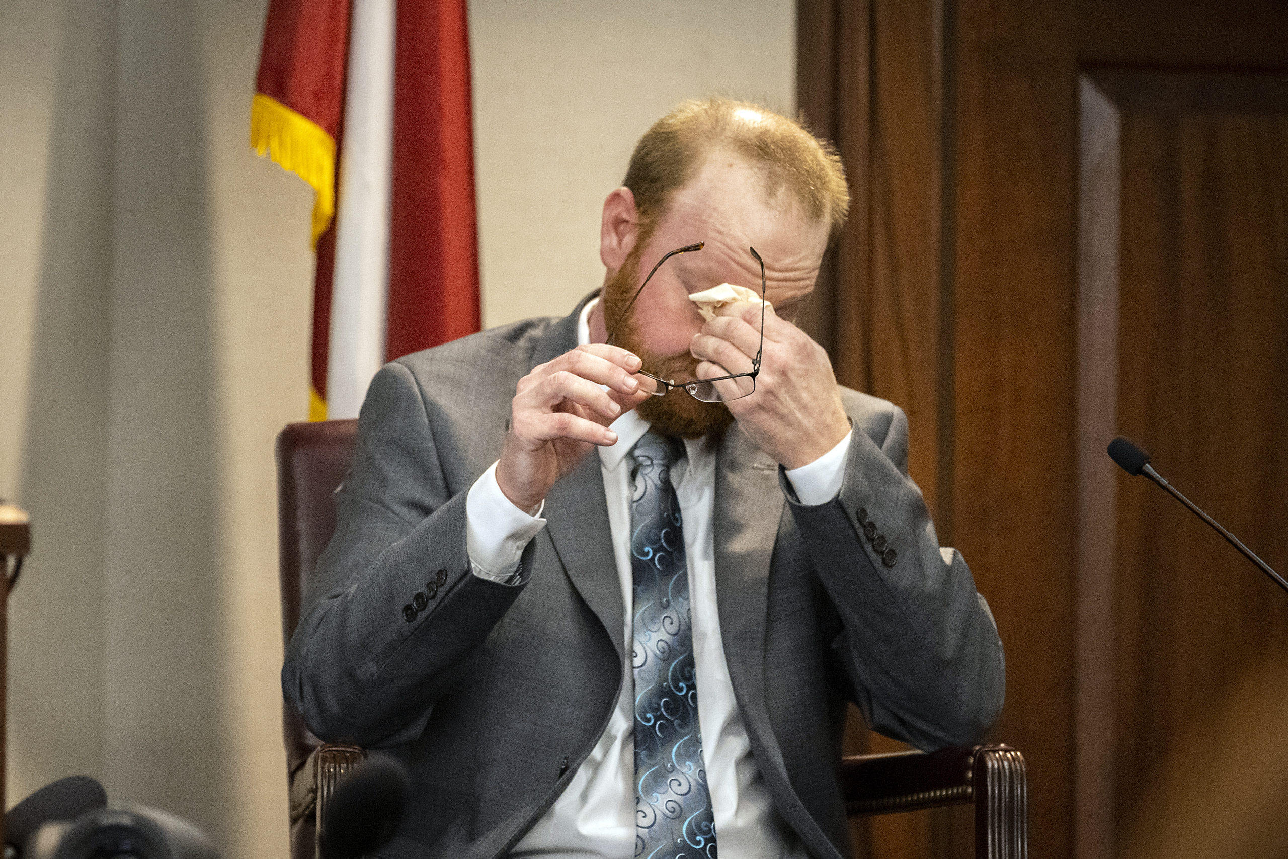 Travis McMichael reacts to questions during his testimony in the trial of he and his father Greg McMichael and neighbor William "Roddie" Bryan in the Glynn County Courthouse, Wednesday, Nov. 17, 2021, in Brunswick, Ga. The three are charged with the February 2020 slaying of 25-year-old Ahmaud Arbery. (AP Photo/Stephen B. Morton, Pool)
