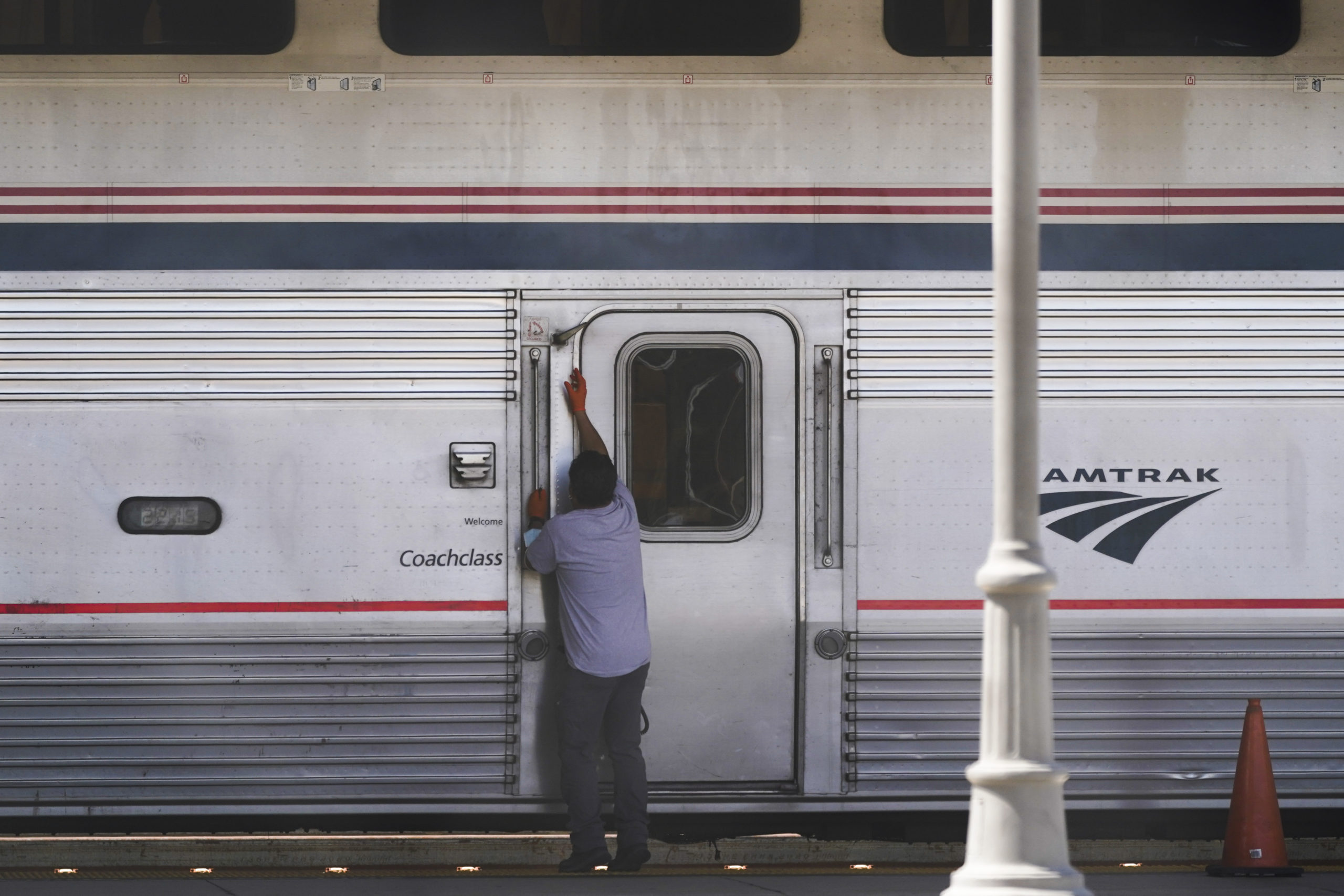 An Amtrak worker opens a door on a train at Union Station in Los Angeles as stoppages are announced on Wednesday, Sept. 14, 2022. Some Amtrak routes will be disrupted due to freight railroad labor negotiations. (AP Photo/Ashley Landis)