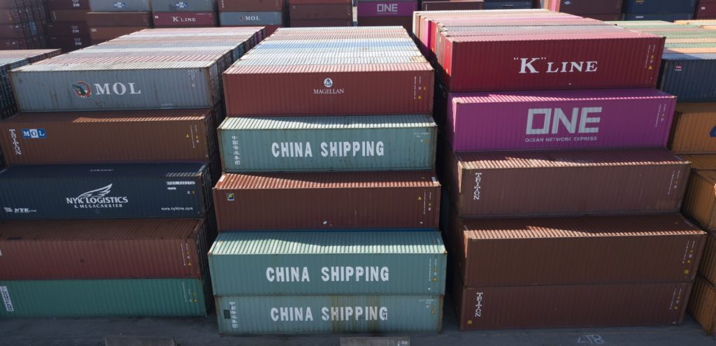 China Shipping Company containers are stacked at the Virginia International’s terminal in Portsmouth, Va., Friday, May 10, 2019. President Donald Trump’s latest tariff hike on Chinese goods took effect Friday and Beijing said it would retaliate, escalating a battle over China’s technology ambitions and other trade tensions. (AP Photo/Steve Helber)