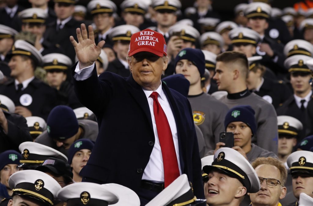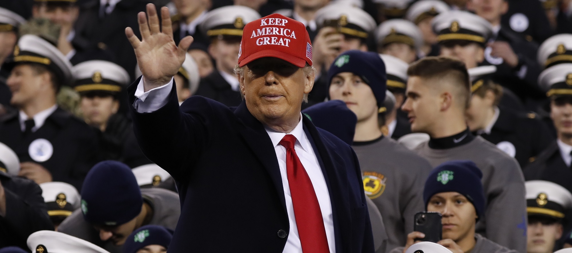 President Donald Trump waves as he sits with Navy midshipman before an NCAA college football game between Army and Navy, Saturday, Dec. 14, 2019, in Philadelphia. (AP Photo/Jacquelyn Martin)