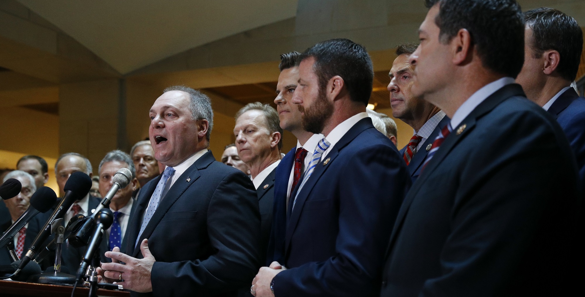 House Minority Whip Steve Scalise, R-La., left, speaks at a news conference in front of House Republicans after Deputy Assistant Secretary of Defense Laura Cooper arrived for a closed door meeting to testify as part of the House impeachment inquiry into President Donald Trump, Wednesday, Oct. 23, 2019, on Capitol Hill in Washington. (AP Photo/Patrick Semansky)