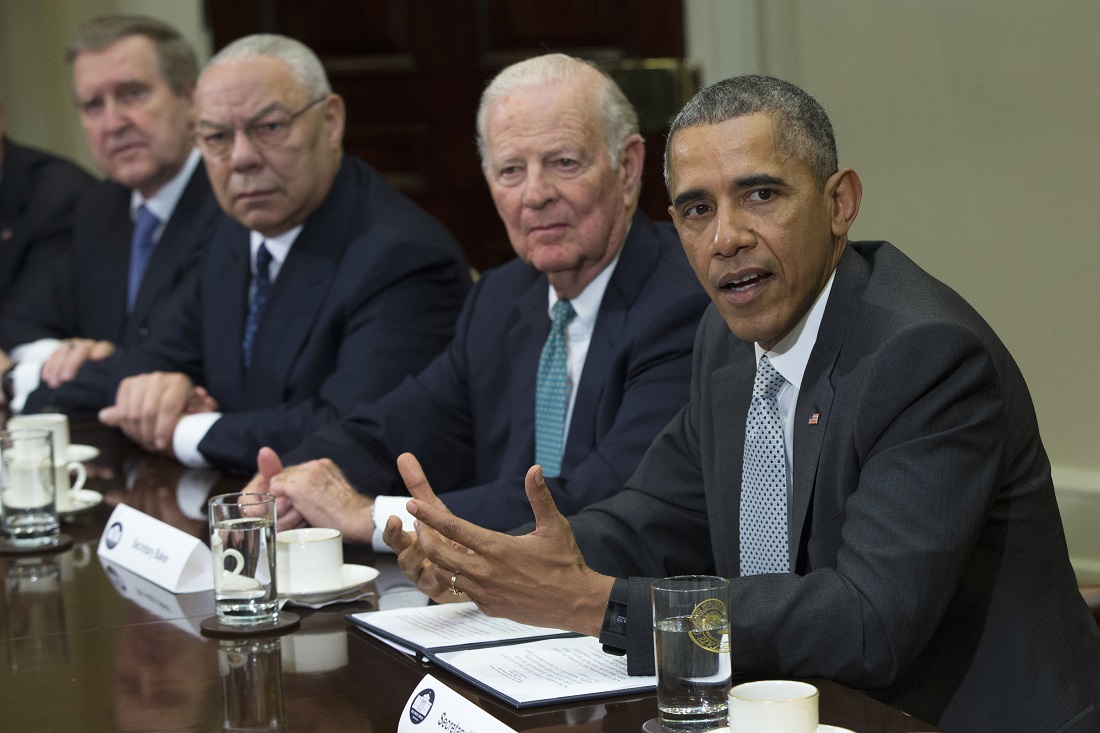FILE – In this Nov. 13, 2015 file photo, President Barack Obama speaks during a meeting with national security leaders to discuss the Trans-Pacific Partnership trade agreement, in the Roosevelt Room of the White House in Washington. President Barack Obama is returning to the rancor of the nation’s capital Sunday after two weeks of fun and sun in his native Hawaii, saying he’s “fired up” for his final year in office and ready to tackle unfinished business. Despite his deep differences with Republicans, Obama has cited two agenda items for 2016 that have bipartisan support: a free trade agreement with 11 other nations called the Trans-Pacific Partnership and changes in the criminal justice system that would reduce incarceration rates for non-violent offenders. Joining him, From left are, former Defense Secretary William Cohen, and former Secretaries of State Colin Powell and James A. Baker III. (AP Photo/Evan Vucci, File)
