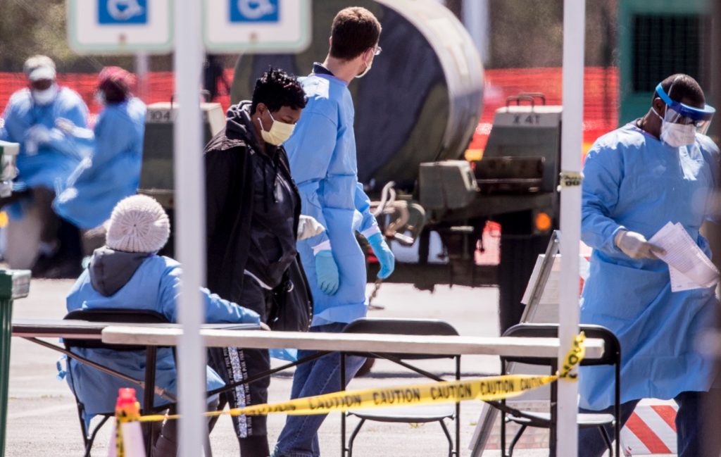 Medical personnel wearing protective equipment screen people referred by doctors for COVID-19 testing in a parking lot of FedEx Field, Monday, March 30, 2020, in Landover, Md. (AP Photo/Andrew Harnik)
