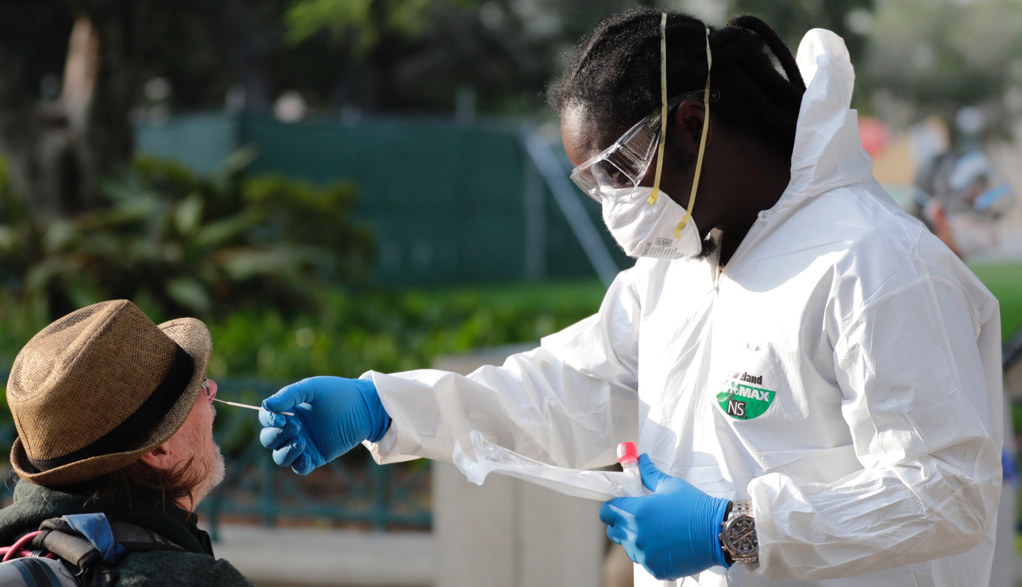 Nurse practitioner Gregory Pierre, right, administers a COVID-19 test to Matthew Sheriff, left, who is homeless, in a program administered by the Miami-Dade County Homeless Trust during the new coronavirus pandemic, Thursday, April 16, 2020, in Miami. The Homeless Trust is targeting the senior population for testing, and is offering housing to those who test positive. (AP Photo/Lynne Sladky)
