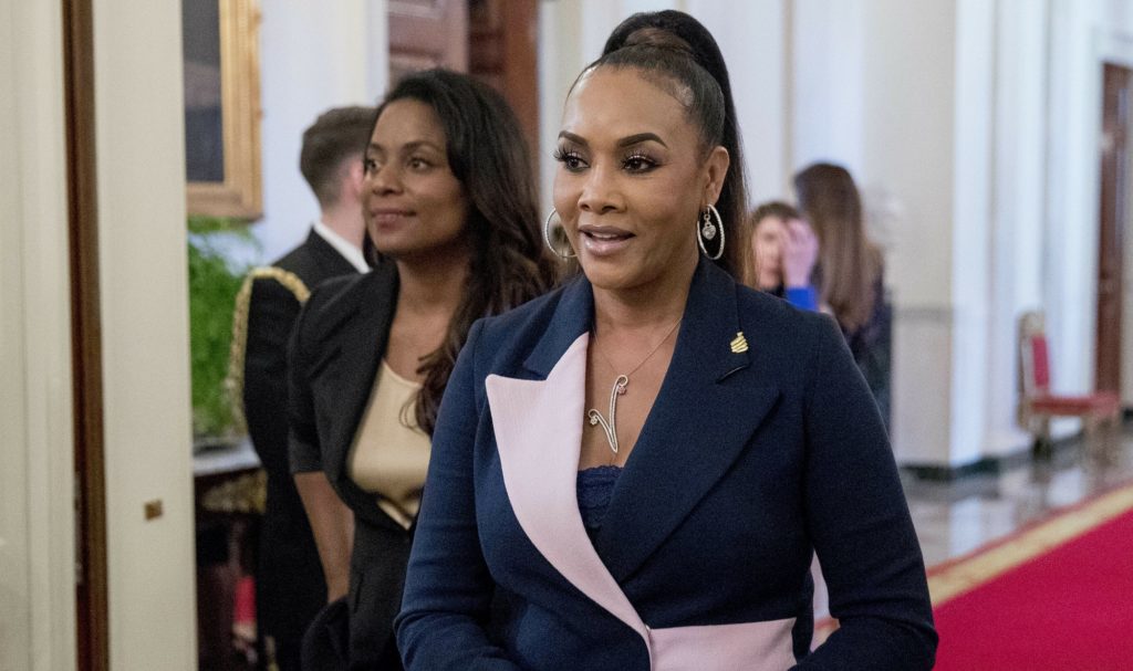 Actress Vivica A. Fox arrives at the 2019 Prison Reform Summit and First Step Act Celebration in the East Room of the White House in Washington, Monday, April 1, 2019. (AP Photo/Andrew Harnik)