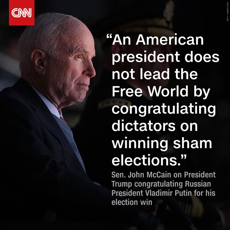 The result of the election, however, was never in doubt, given Putin’s autocratic stranglehold on power. Trump’s decision to congratulate Putin on his electoral win drew consternation from McCain who said that “an American president does not lead the free world by congratulating dictators on winning sham elections.”