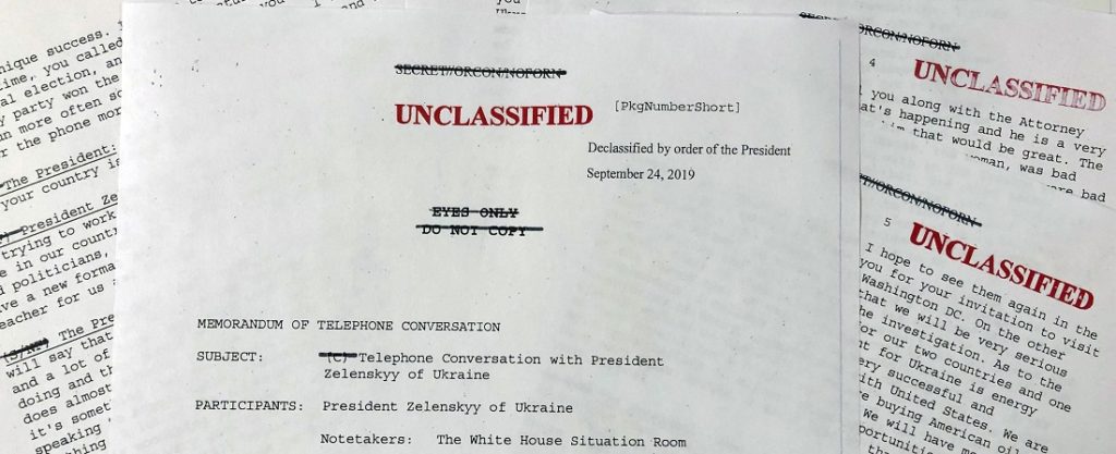 A White House-released rough transcript of President Donald Trump’s July 25, 2019 telephone conversation with Ukraine’s newly elected president Volodymyr Zelenskiy, released Wednesday, Sept. 25, 2019. (AP Photo/Wayne Partlow)