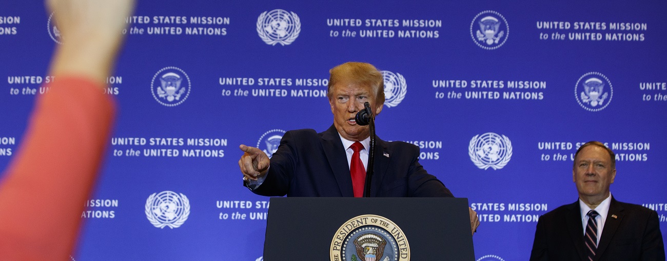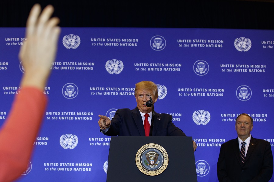 Secretary of State Mike Pompeo listens as President Donald Trump speaks during a news conference at the InterContinental Barclay New York hotel during the United Nations General Assembly, Wednesday, Sept. 25, 2019, in New York. (AP Photo/Evan Vucci)