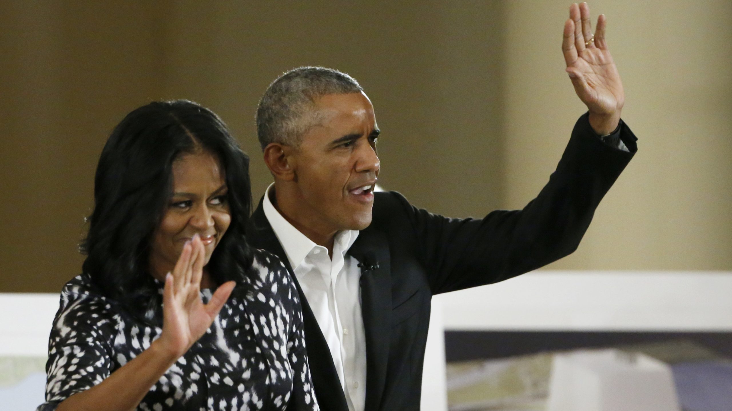 Former President Barack Obama and former first lady Michelle Obama waves as they arrive at a community event on the Presidential Center at the South Shore Cultural Center, Wednesday, May 3, 2017, in Chicago. The Obama Foundation unveiled plans for the former president's lakefront presidential center, showcasing renderings and a model at an event where former President Barack Obama and first lady Michelle Obama were expected to give more details. (AP Photo/Nam Y. Huh)