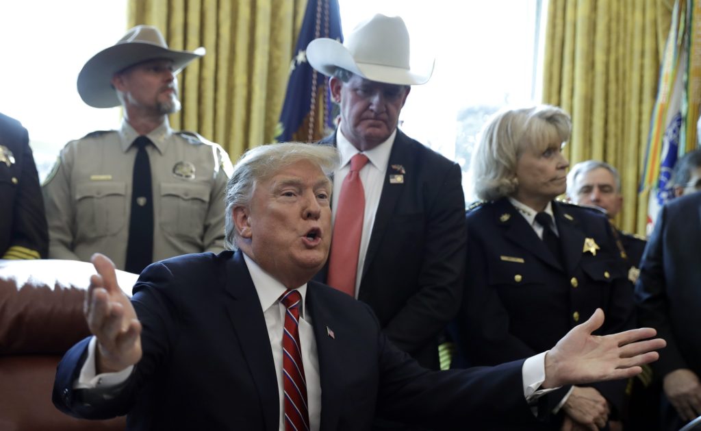 President Donald Trump speaks about border security in the Oval Office of the White House, Friday, March 15, 2019, in Washington. Trump issued the first veto of his presidency, overruling Congress to protect his emergency declaration for border wall funding. (AP Photo/Evan Vucci)