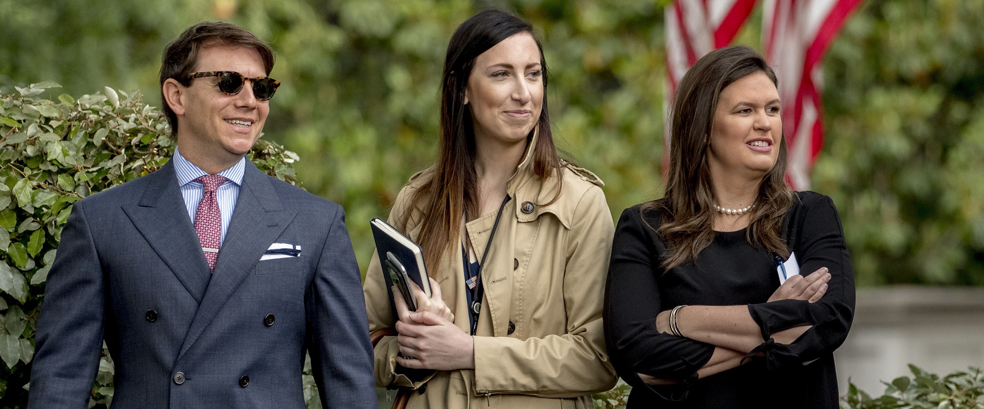 From left, Deputy White House press secretary Hogan Gidley, White House director of broadcast media Alexa Henning, and White House press secretary Sarah Huckabee Sanders stand along Pebble Beach on the North Lawn of the White House, Thursday, May 16, 2019, in Washington. (AP Photo/Andrew Harnik)